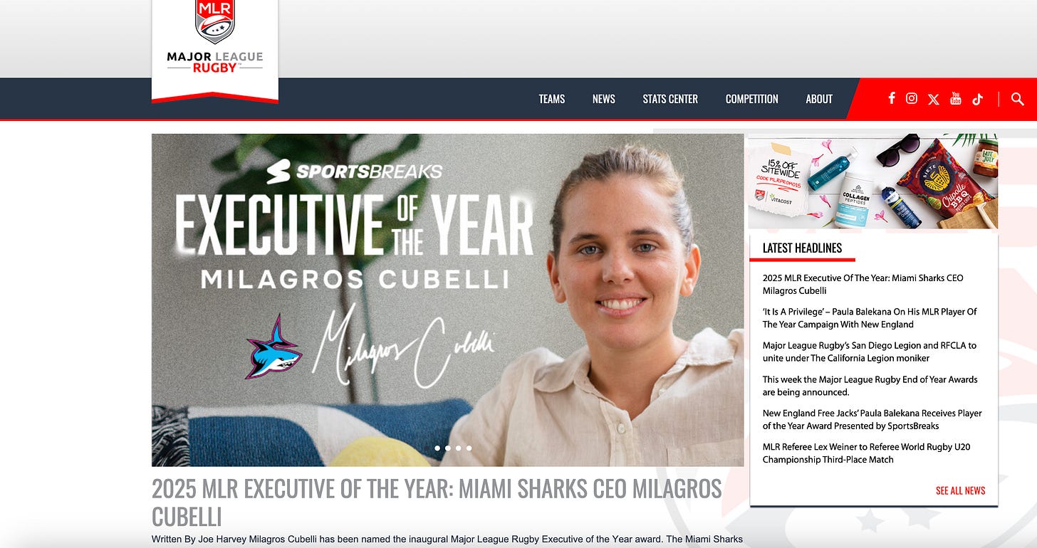 The links to the CEO profile piece appear to be broken. The link is https://www.majorleague.rugby/news/2025-mlr-executive-of-the-year-miami-sharks-ceo-milagros-cubelli